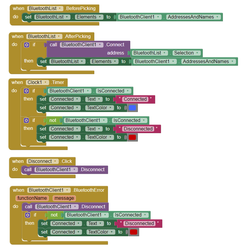 Tamam, şimdi programı veya uygulamanın arkasındaki blokları görelim. İlk önce, sol tarafta akıllı telefonu Bluetooth modülüne bağlamak için bloklar bulunuyor.