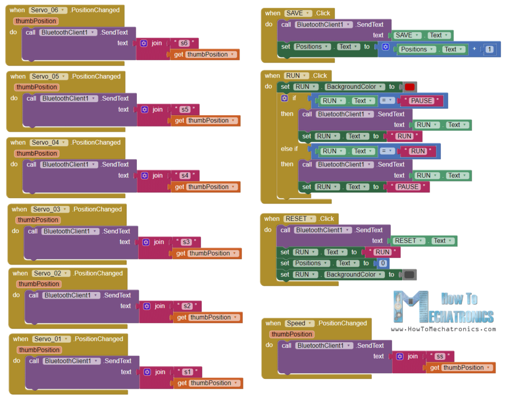 Ardından servo pozisyon kontrolü için sürgü bloklarına ve robot kolunu programlamak için düğmeler bloklarına sahibiz. Bu yüzden, kaydırıcının konumunu değiştirirsek, Bluetooth işlevini kullanarak .SendText, Arduino’ya bir metin göndeririz. Bu metin, kaydırıcının geçerli değerinin yanı sıra hangi kaydırıcının değiştirildiğini gösteren bir önekten oluşur.